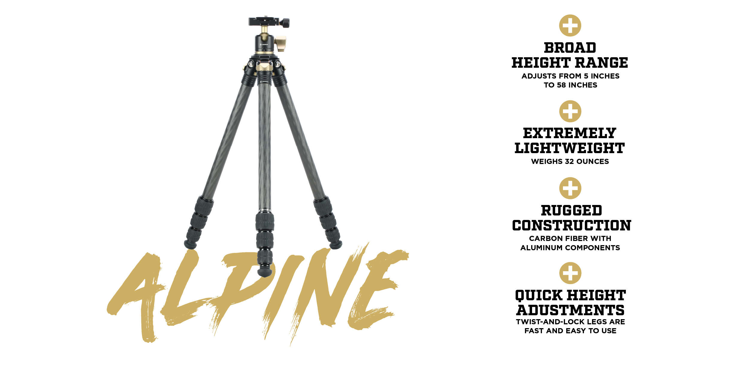 Leupold’s Alpine Carbon Fiber Tripod takes lightweight performance to the next level. If you’re constantly counting ounces because you’re packing in for miles, look no further. Its compact design weighs in at a mere 32 ounces, while its rugged carbon fiber and metal construction stand up to the harshest conditions.
