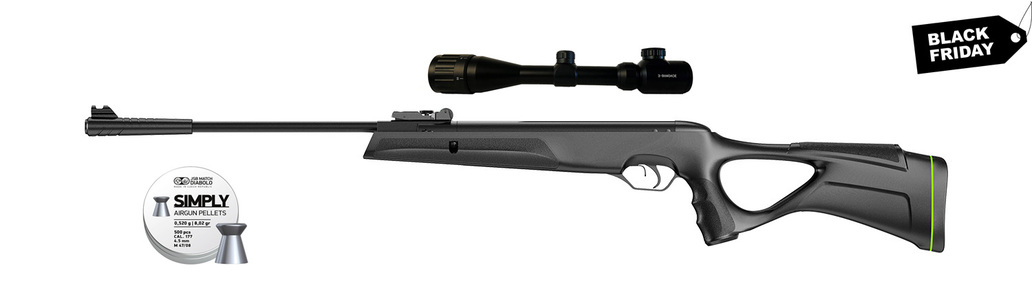 Skön design med tumhålskolv i komposit. Tillverkad i ett robust kompositmaterial med strukturerade greppytor. Geväret har maximal licensfri effekt med bra precision. Justerbart avtryck mellan 1,3 - 3,8 kg.