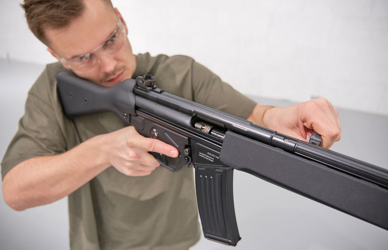 Ute på fältet är gasdrivna Airsoft-versionen ett utmärkt val för utmanande matcher. Den robusta stålstommen och glasfiberförstärkta polymeren efterliknar originalet väl och ger HK33 en autentisk känsla. En spännarm i stål som matchar originalet, det typiska trumsiktet och en ergonomisk kolv fulländar gevärets övertygande utseende.