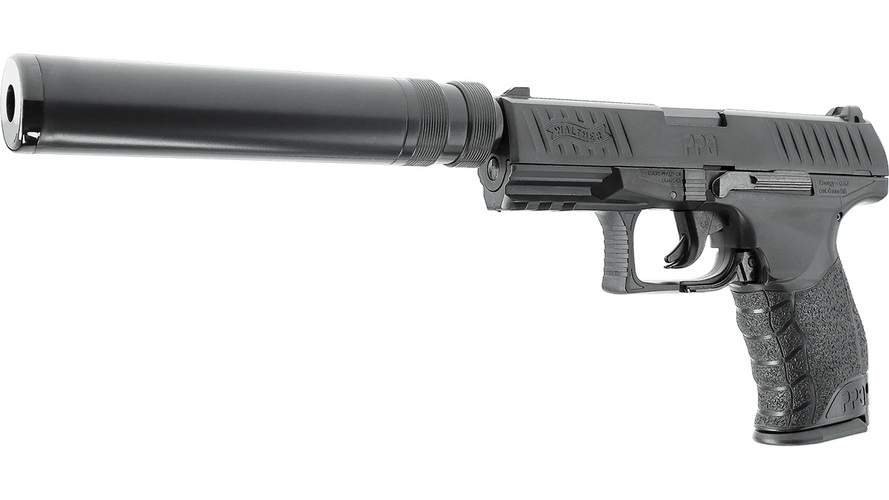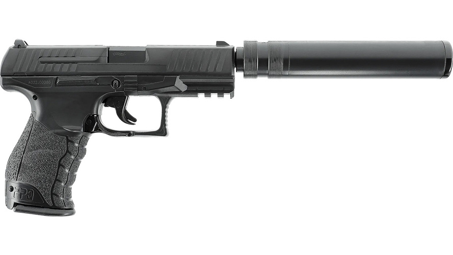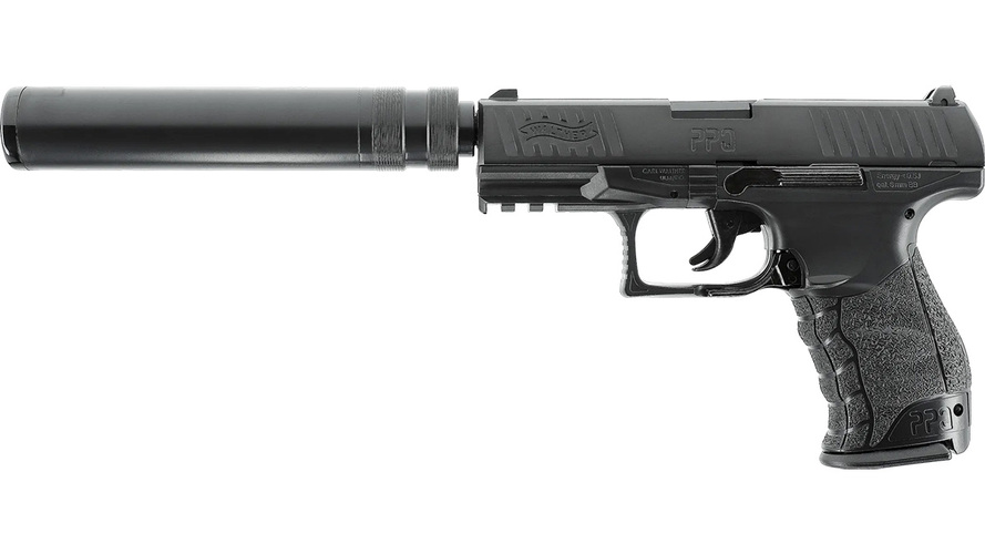 Fjäderdriven Airsoft-version av Walther Duty Pistol med mantel i polymer, avtagbar ljuddämparattrapp, Heavy- och HiCap-magasin (14 / 100 skott)