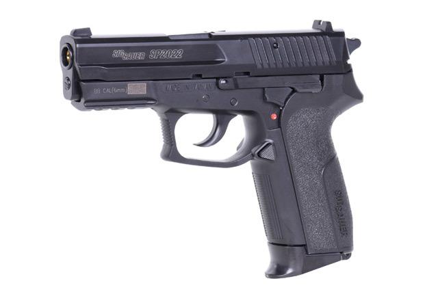 Fjäderdriven Sig Sauer SP2022. Tillverkad av polymer. Utrustad med en integrerad picatinnyskena för montage av tillbehör.