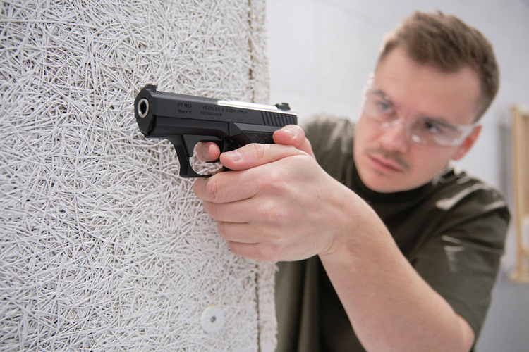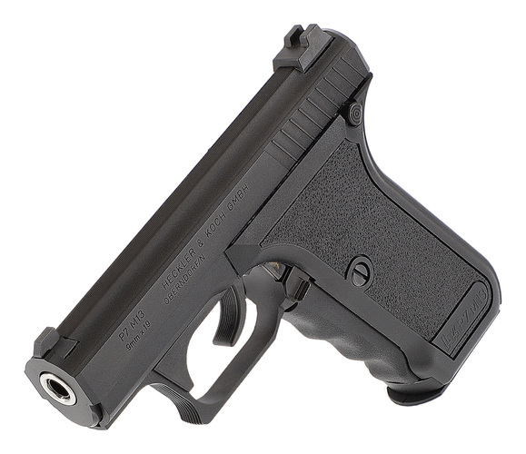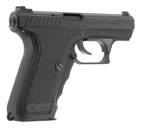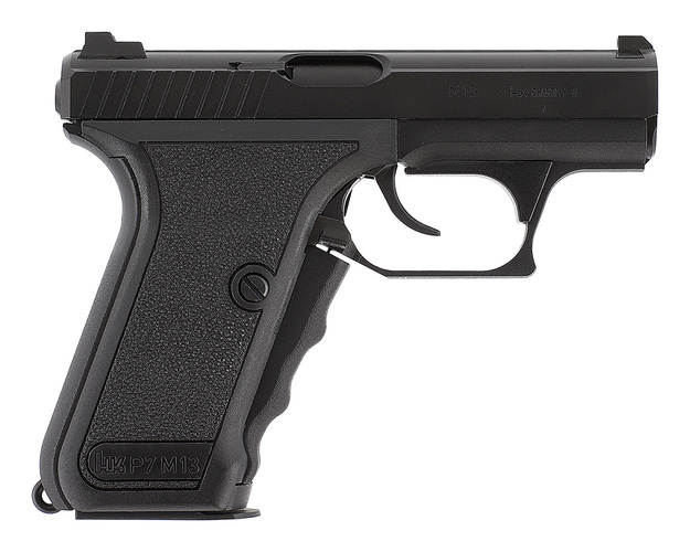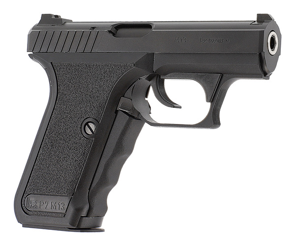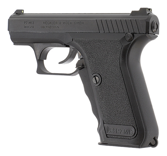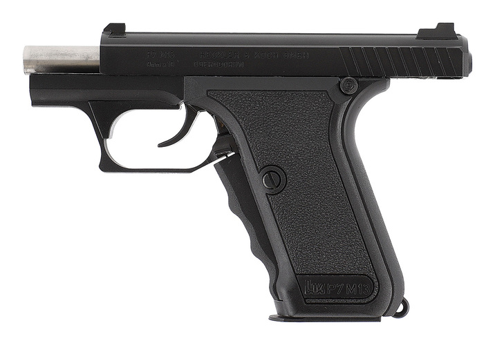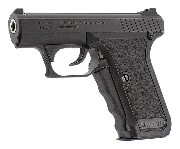 Ursprungligen utvecklad som ett tjänstevapen för polisen, den legendariska HK P7 är utrustad med en unik greppspännarm, där den stora spännarmen på handtagets framsida måste klämmas in, vilket spänner slagstiftet. P7 hade ingen annan klassisk säkring. Medan den tidiga P7 hade en magasinsspärr på handtagets undersida och ett enkelradigt magasin, har P7 M13 en ambidextriös magasinsspärr bredvid avtryckaren och ett dubbelradigt magasin. Med den fasta pipan var den riktiga P7 känd för sin höga precision. P7 användes bland annat av den tyska GSG 9.