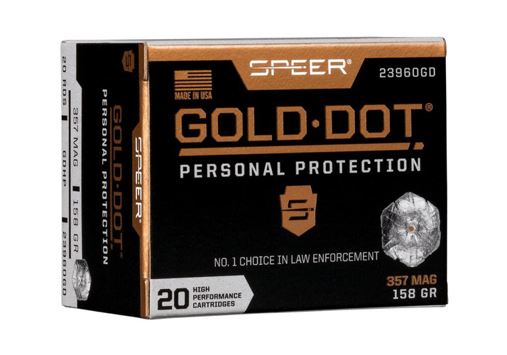 Our original Gold Dot line remains a benchmark for both self-defense and duty use, and it's earned the trust of law enforcement world-wide. It features a pressure-formed lead core that's bonded to an extremely uniform jacket a single atom at a time. This virtually eliminates separation on impact for more retained weight and penetration to crucial depths. Its Gold Dot hollow-point design expands consistently through the full range of barriers. Ignition and cycling are guaranteed thanks to sealed primers and nickel-plated brass.