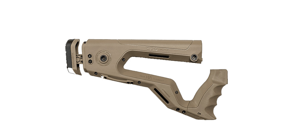 The new generation CQR Gen. 2 combines functionality and design. Thanks to the ergonomically shaped handle, the CQR Gen. 2 ensures a comfortable shooting experience for almost any hand size. In addition, the adjustable shoulder rest can be perfectly adapted to the user's arm length. QD eyelets also enable the use of sling swivels with a push button release system. Fits standard A2 buffertubes.