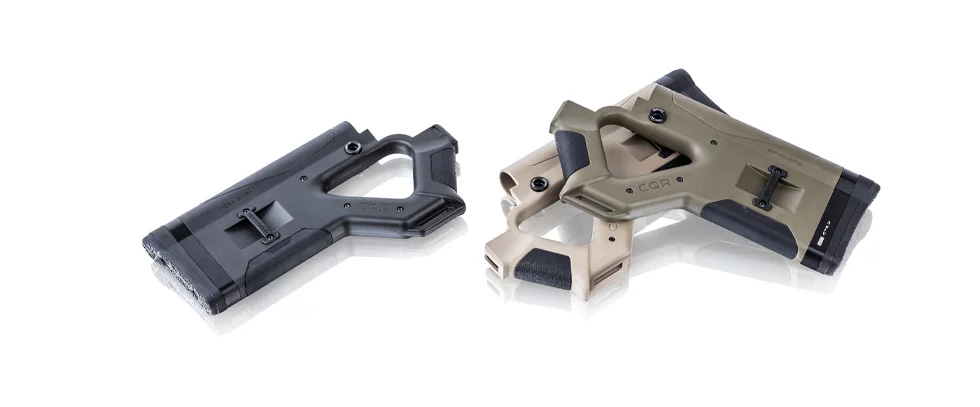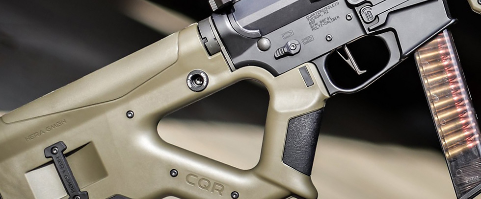 Hera CQR stock system. Designed for enthusiasts. Made of impact-modified polymer, the CQR, in combination with the CQR fore grip, offers the most compact and ergonomic fixed stock system for the AR15 / AR10 platform. Fits standard carbine (Mil-Spec) buffertubes, available in black, tan and green.