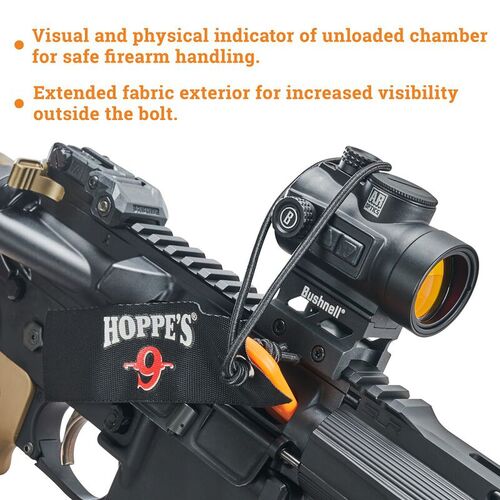 Hoppe's säkerhetsflaggor är tillverkade i en hållbar polymer med tydlig färg. Det elastiska bandet kan man fästa runt slutstycke eller sikte för att man inte ska tappa bort flaggan.