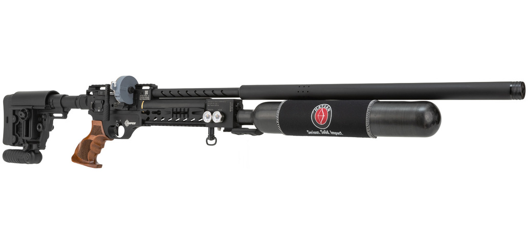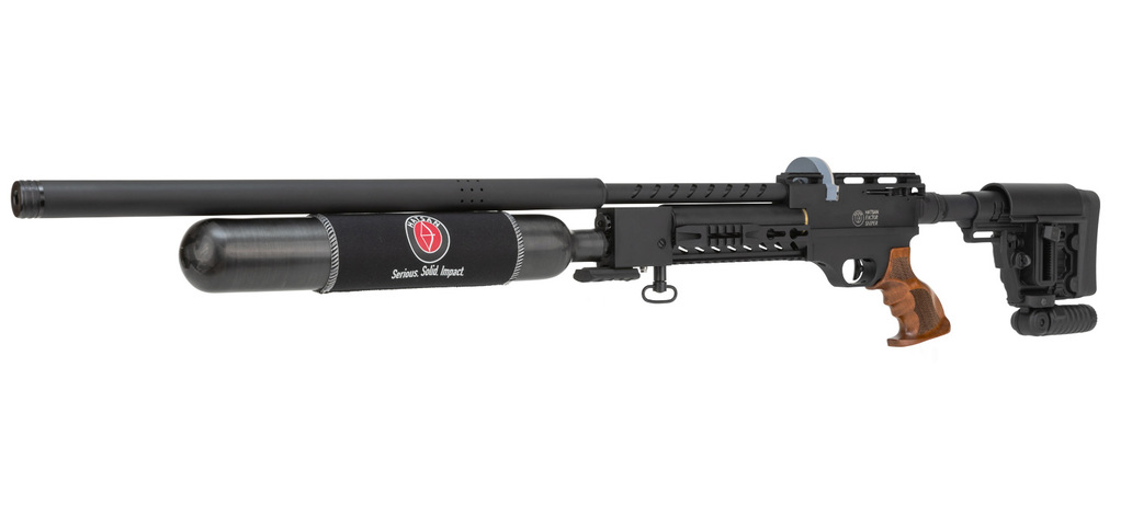 Hatsan Factor här i ett taktiskt sniper-utförande. Justerbar bakstockmed inbyggt skjutstöd, flaska i kolfiber och justerbar regulator är bara några av funktionerna.