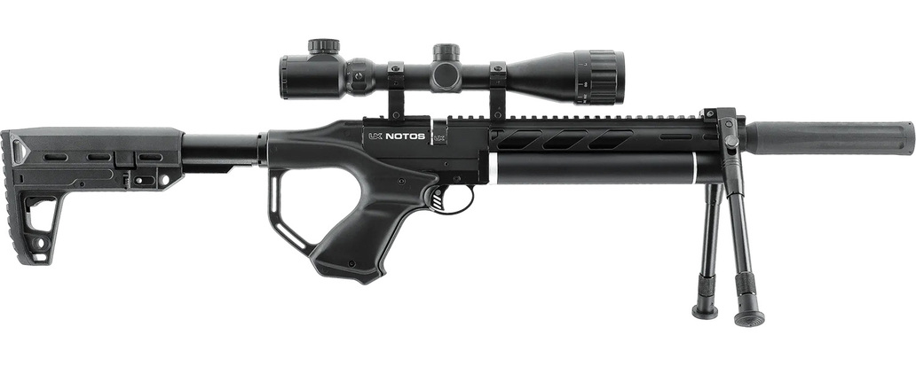 Som en typisk karbin med repeterfunktion är UX Notos kompakt, lättviktig och enkel att hantera. Setet, som inkluderar PCP-geväret i kaliber 4,5 mm med en energi på < 7,5 joule, ett avtagbart teleskopiskt benstöd och 3-9x40 kikarsikte med belyst riktmedel i rött och grönt. Geväret erbjuder allt som behövs, direkt ur lådan.