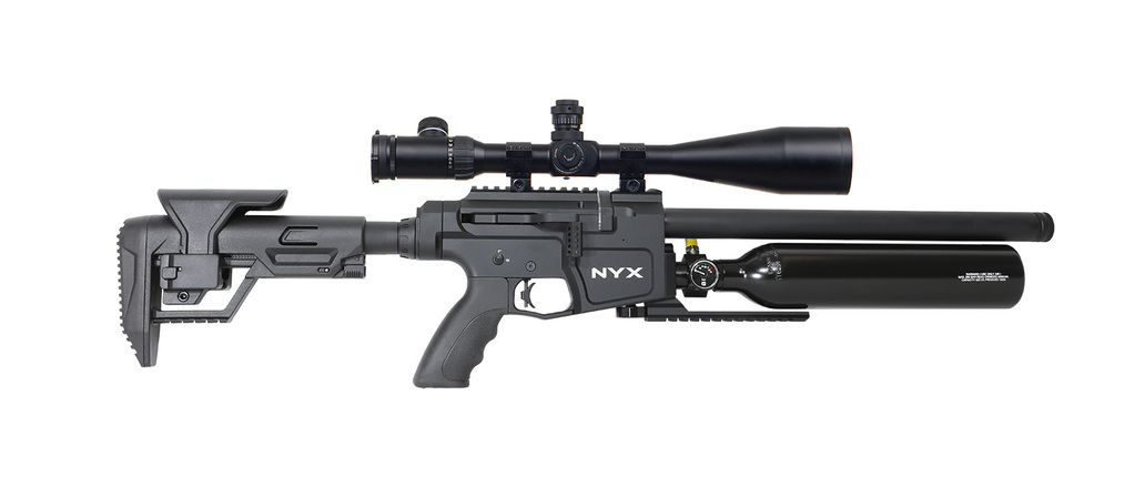 Högpresterande luftgevär med en otrolig kvalité och prestanda för pengarna. Här i en kompakt smidig version. NYX är byggd runt en solid plattform i ett stycke med friliggande pipa och stor 425cc tub. Modellen har justerbar utgångshastighet men levereras i licensfritt utförande med fast effekt och max 10 Joule. AR-designen möjliggör att montera pistolgrepp och kolv från andra tillverkare.