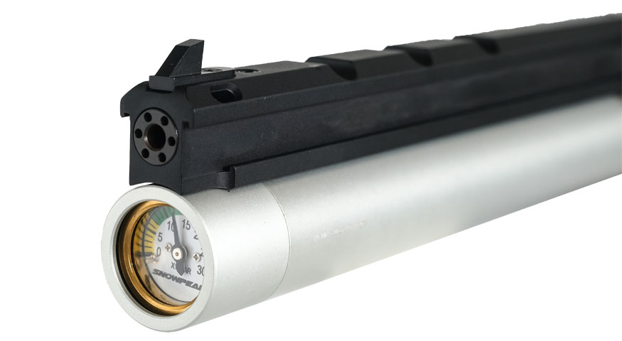 PP20 är en instegsmodell för den som vill börja med pistolskytte. Den har justerbart avtryck och grepp i bok. Manometern längst fram på den avtagbara 42cc tuben är tydlig och lättläst.