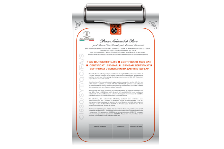 Fabarm är den enda tillverkaren som trycktestar och certifierar sina hagelpipor till hela 1630 Bar.