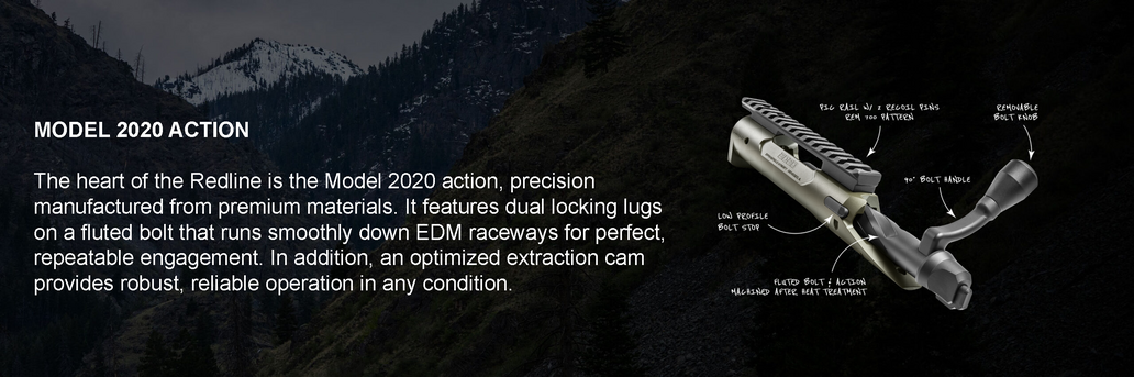 Embracing attributes of the classic scout rifle, the Model 2020 Redline takes the concept into the 21st century with the use of modern materials and cutting-edge design. The result is a lightweight and compact rifle ready for hunts where every ounce counts.