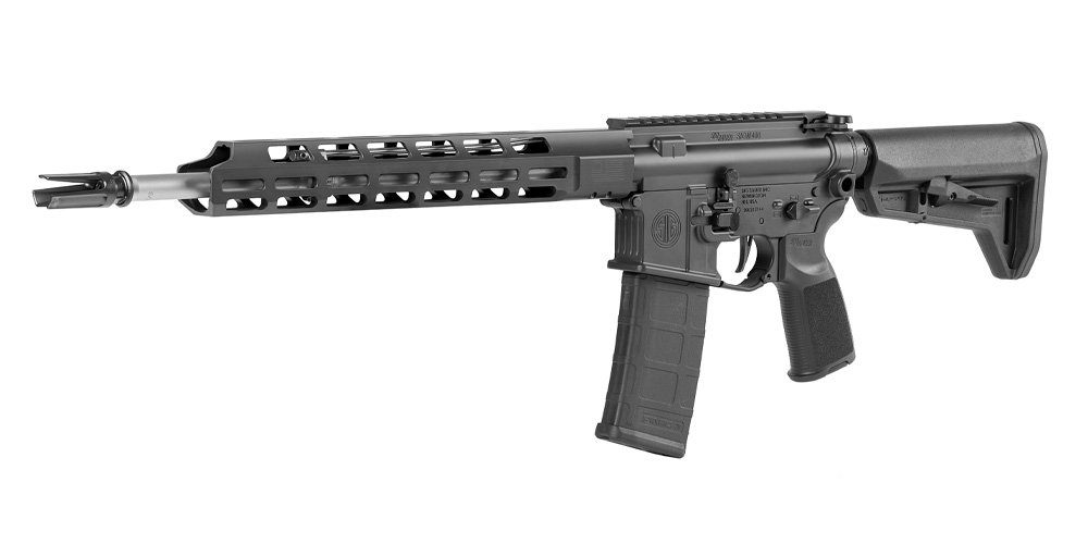 The M400-TREAD features a free-floating M-LOK enhanced handguard that is lightweight yet rigid for extreme control and ease of mounting accessories such as lights and handstops. The lower receiver has an ambidextrous safety for right or left-handed operation and includes an integrated QD mount for easy sling attachment. Chambered in 5.56 NATO, the M400-TREAD has a 16” stainless steel barrel offering extreme durability and corrosion resistance while improving accuracy. The barrel is also fitted with a 3-prong flash hider and has an extremely versatile 1:8 twist rate. The M400-TREAD also has a mid-length gas system offering smoother operation and reduced recoil. The new M400-TREAD includes a SIG Matchlite 2-stage trigger for enhanced control and improved accuracy as well as a MAGPUL SL-K telescoping stock for easy adjustment and a customized fit. The new M400-TREAD. All of the freedom, all of the features, with none of the compromises.