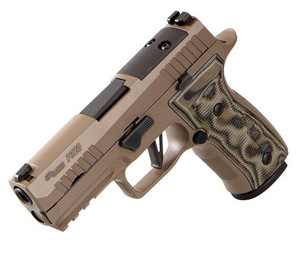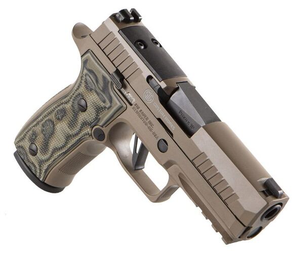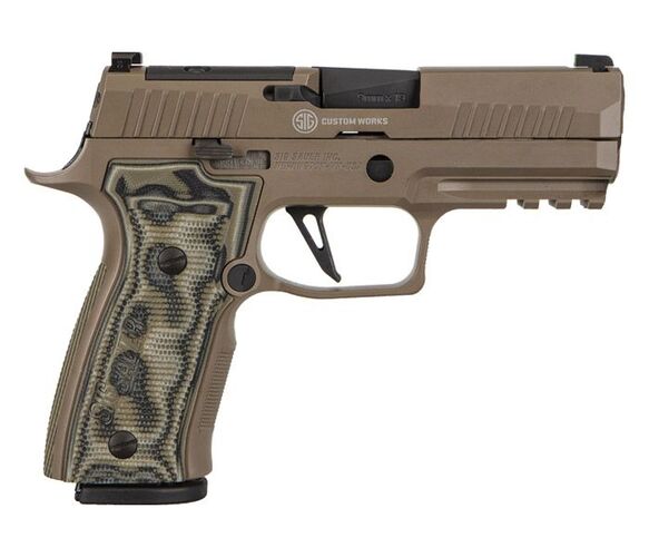 The Custom Works P320 AXG Scorpion features the newly developed AXG metal grip module, precision machined with deep undercuts, and an extended beavertail for an ergonomic, comfortable fit, and is fitted with signature Scorpion G10 grips from Hogue for complete control. Both the slide and frame are finished with a Cerakote Elite coating in FDE for extreme protection. It utilizes the advanced LEGION lightened, skeletonized, flat-bade trigger, and includes a SIG Pro Series removable optics plate with dovetail XRAY3 day/night rear sights and XRAY3 day/night front sight and also comes with (3) P320 magazines.
