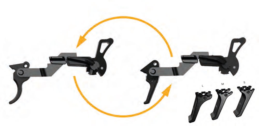 Välj och byt efter behovATC-Plattformen möjliggör byte av avtryck. ATC Rock levereras med ett SAO-trycke (Single Action Only) och ATC Base ett SA/DA-trycke (Single Action / Double Action). Båda varianterna passa i både Rock och Base. Tyckena har manuell säkring på båda sidorna. SA/DA trycket har även decocking-funktion som slackar hammaren när man trycker upp säkringen förbi ändläget. SAO har utbytbara avtryckarblad som flyttar bladet fram eller bak. Tryckena är justerbara och levereras från fabrik enligt nedan:
