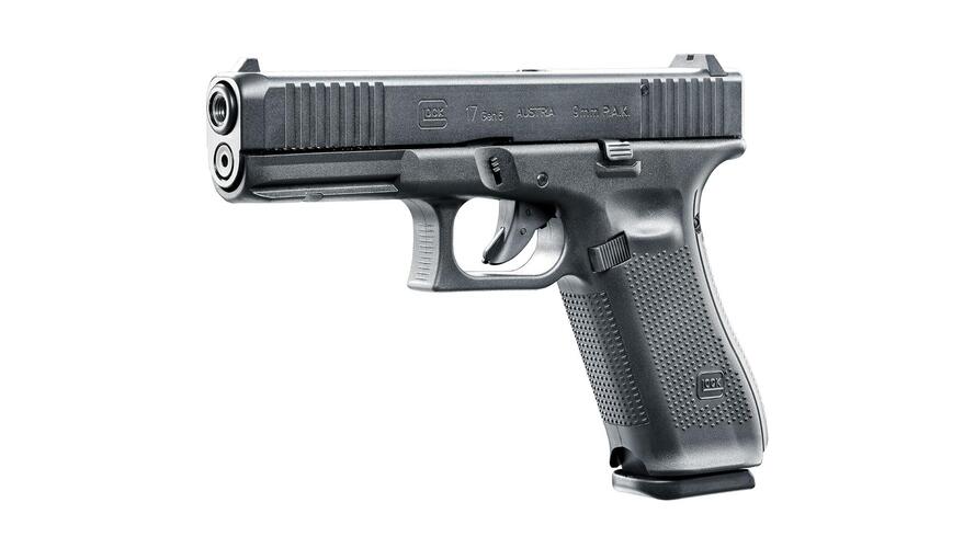 This blank firing version of the GLOCK 17 Gen5 9 mm P.A.K. has a typical funneled magazine well and front serrations. The reversible magazine catch and ambidextrous slide stop lever guarantee quick action and easy magazine changes for both right-handers and left-handers. As with the original, the magazine holds 17 rounds and has a highly visible orange follower. With its steel reinforcement and loaded chamber indicator, this gun offers everything you could wish for.