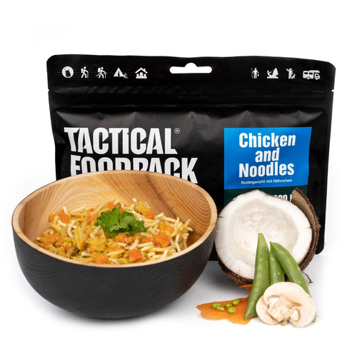 Nudlar med kyckling, med en behaglig smak av kokosmjölk och olika kryddor. 100% naturlig, utan konserveringsmedel och tillsatser. Tactical Foodpack är den bästa frystorkade maten för camping, vandring och utomhusäventyr.