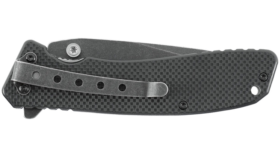 En kompakt fickkniv för varje dag: Det svarta stonewash-behandlade spearpoint-bladet kan öppnas med en flipper eller ett ambidextriöst tumgrepp. Ett linerlås håller bladet låst på plats. De svarta G10-handtagsidorna är fastskruvade; clipet är avtagbart.