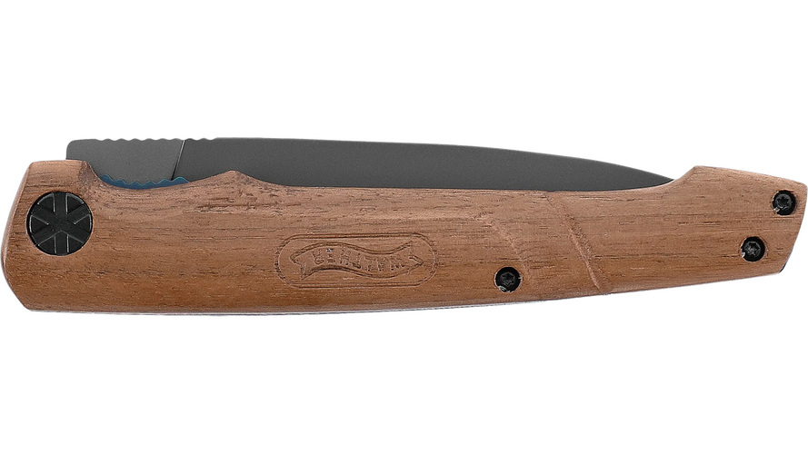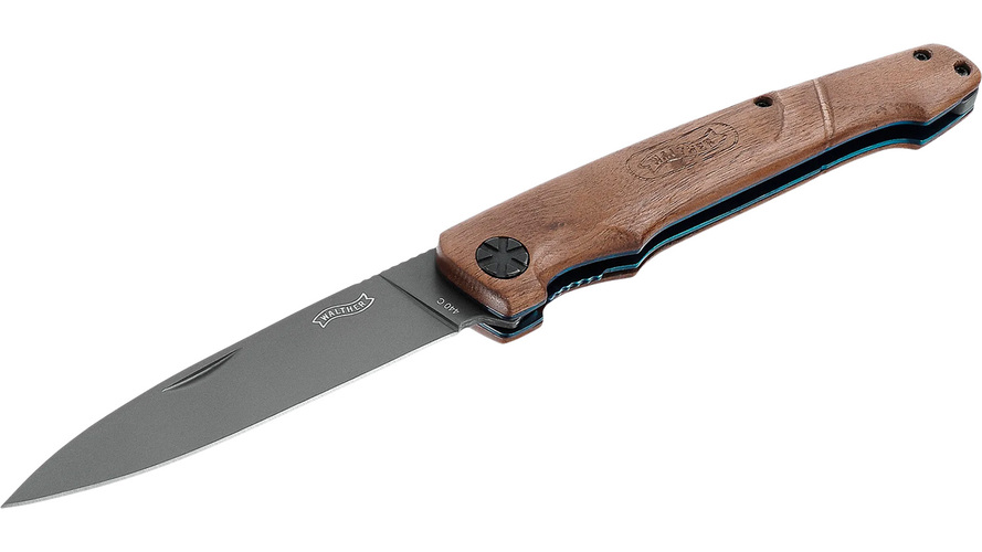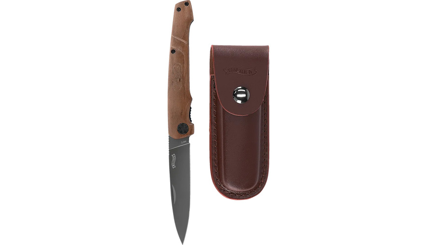 Outdoorkniv med ergonomiskt texturerat grepp tillverkat av valnöt. Grått droppoint blad av 440C stål har en pålitlig linerlock låsning. Kniven levereras med ett högkvalitativt läderfodral.