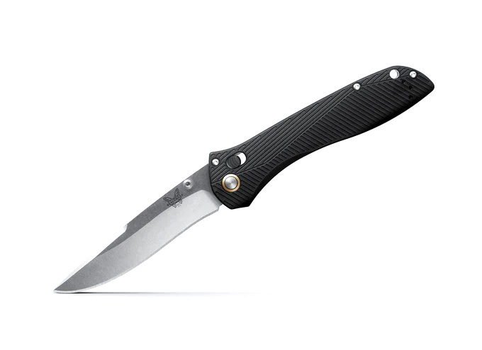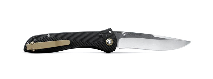 AXIS LOCKBenchmades fällknivar är utrustade med en genial låsmekanism som av många rankas som nr. 1. Fördelarna i Axis-lock ligger i snabbheten, hållbarheten och säkerheten. Snabbheten kan jämföras med fjäderassisterad modell (som inte får säljas i Sverige), med fördelen att man med bara en hand lika snabbt fäller in bladet. Tryck in knappen, gör en lätt knyck och bladet åker in, eller ut. Låset är helt oberoende vilken hand du håller kniven i.