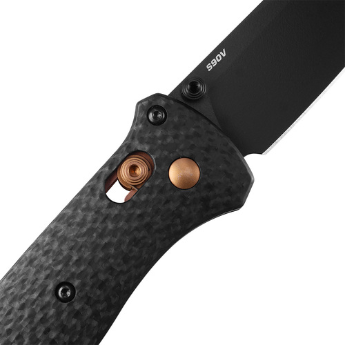 537BK-10 Bailout® pressar ultralätt kraft till sin maximala potential. Vår hyllning till de som gillar utmanande vandringar längs vägar där asfalten tog slut för timmar sedan. 537BK-10 har ett ultralätt, diamanttexturerat kolfiberhandtag kombinerat med ett slitstarkt S90V-blad, designat i den klassiska Bailout® tanto-stilen. Toppad med en svart Cerakote®-bladfinish och snygga mörka kopparaccenter, är 537BK-10 Bailout® ett smalt fickverktyg som uppnår ett optimalt förhållande mellan styrka och vikt för både hård användning och vardagsbruk.