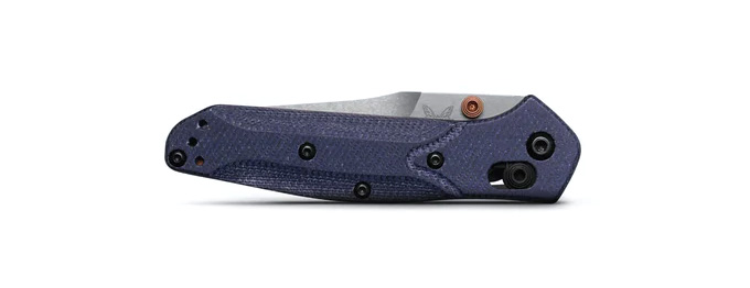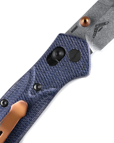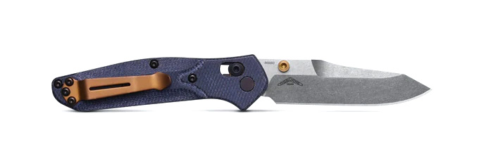 Den nya 945-04 Mini Osborne har ett M390 reverse tanto-blad med satinfinish. 945-04 är en nedbantad version av den fullstora Osborne och är utrustad med texturerade blå denim-micarta greppsidor och mörka kopparfärgade PVD-detaljer.