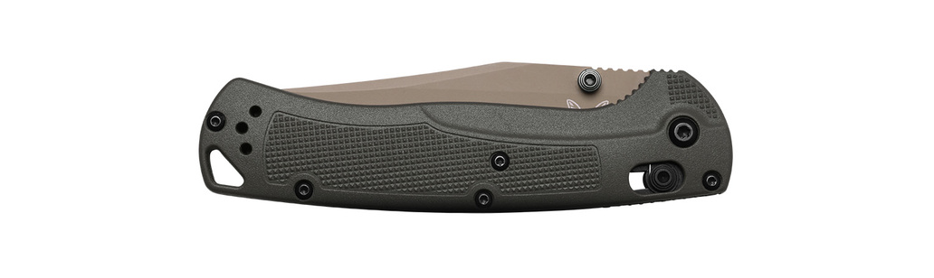 AXIS LOCKBenchmades fällknivar är utrustade med en genial låsmekanism som av många rankas som nr. 1. Fördelarna i Axis-lock ligger i snabbheten, hållbarheten och säkerheten. Snabbheten kan jämföras med fjäderassisterad modell (som inte får säljas i Sverige), med fördelen att man med bara en hand lika snabbt fäller in bladet. Tryck in knappen, gör en lätt knyck och bladet åker in, eller ut. Låset är helt oberoende vilken hand du håller kniven i.