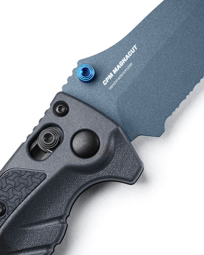 AXIS LOCKBenchmades fällknivar är utrustade med en genial låsmekanism som av många rankas som nr. 1. Fördelarna i Axis-lock ligger i snabbheten, hållbarheten och säkerheten. Snabbheten kan jämföras med fjäderassisterad modell (som inte får säljas i Sverige), med fördelen att man med bara en hand lika snabbt fäller in bladet. Tryck in knappen, gör en lätt knyck och bladet åker in, eller ut. Låset är helt oberoende vilken hand du håller kniven i.