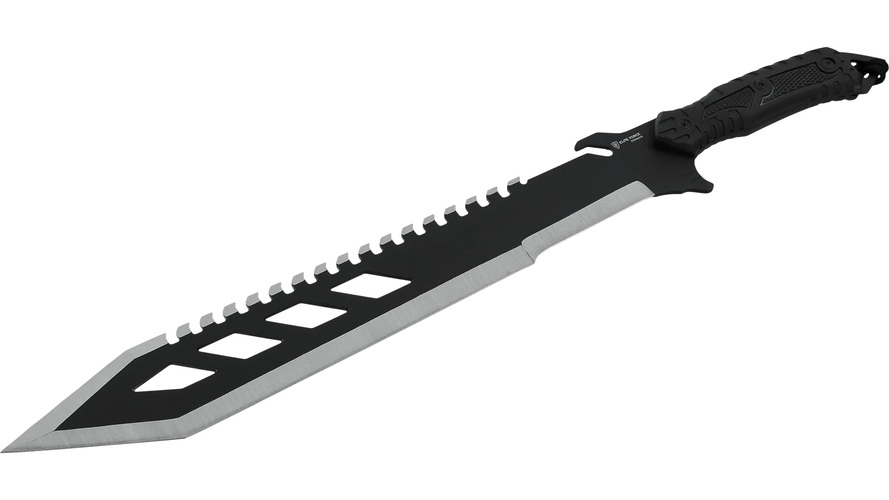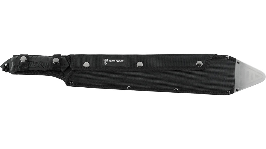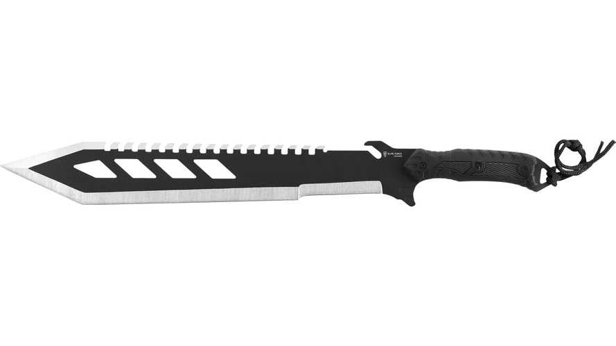 Det vinklade, 44 cm långa och 3,8 mm tjocka bladet på denna ovanliga machete är tillverkad av svart rostfritt stål. Den är perfekt för att hugga genom vegetation. Det ergonomiskt formade syntetiska greppet med ett fingerskydd passar bra i handen. Nylonfodral med bältesögla ingår.