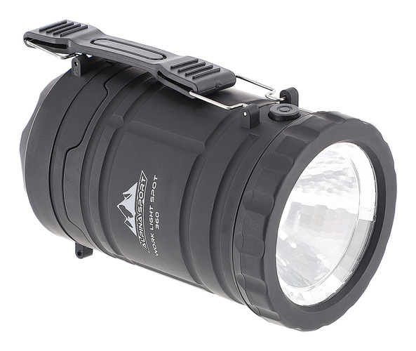 Den mångsidiga Alpine Sport Work Light Spot 360 utmärks av ett brett användningsområde. Använd den som en klassisk handhållen lampa, eller som en 360°-lykta för arbete eller camping genom att helt enkelt dra ut 360°-insatsen från lampans övre del. Tre vanliga AA-batterier (1,5 V) används som strömkälla.
